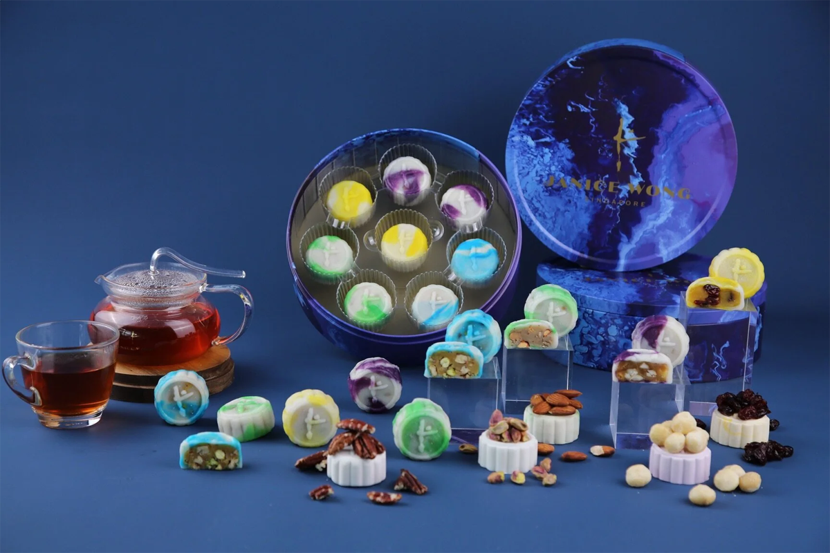 Janice Wong presents a thoughtful selection of baked, snow skin and signature chocolate mooncakes. Its signature drip painted chocolate mooncakes returns this year, offering a delectable range of new and familiar flavours for fans. Set on a base of chocolate sponge, flavours like coffee and chocolate with lashings of kopi ganache, caramelised sea salt pecan dark chocolate, and peanut butter snickers with peanut butter paste and salted caramel ganache, are spins on classics.