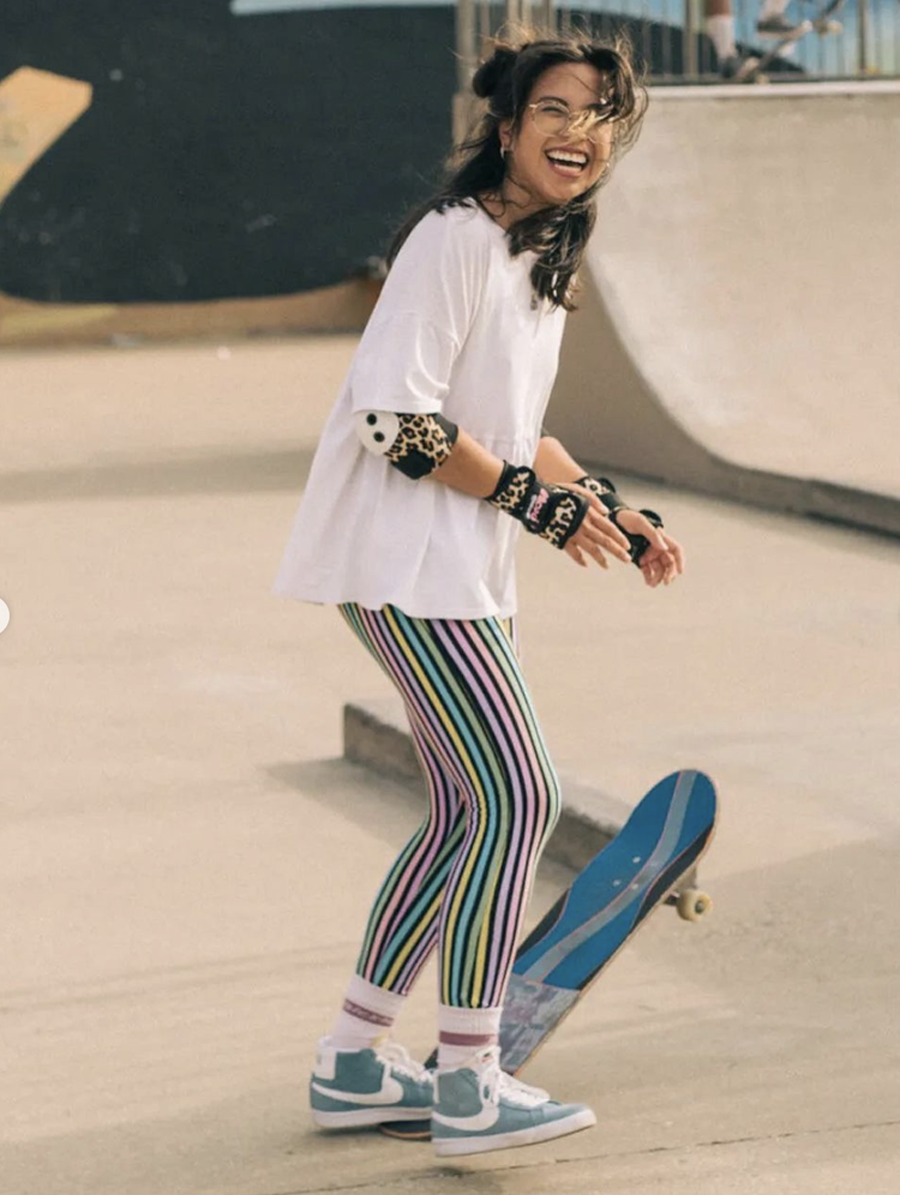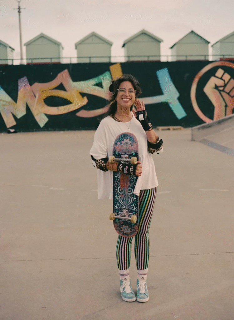 Skateboarding taught me to look at the same world through a different lens – and I welcome that! I remember the first time I found a ‘spot’ I wanted to skate. At the time I was still learning to push. My boyfriend and I would skate around the quiet streets during lockdown, and I found this little arch, lower in height than my hip and about two metres wide. I had this urge to just crouch down and skate through it, so I did. As I approached it, knees shaking because my balance wasn’t very good yet, I (quite obviously and dramatically) tripped and came crashing to the ground in a heap of laughter even though I had just seen my life flash before my eyes. I learned in that moment that fear was just that – fear. I still had all my limbs and, really, I felt okay. That experience alone I won’t forget because I realised I was seeing something simple as something much more exciting. I know after that ungracious fall. I daydreamed about how much had changed since I picked up a piece of wood with four wheels on it.